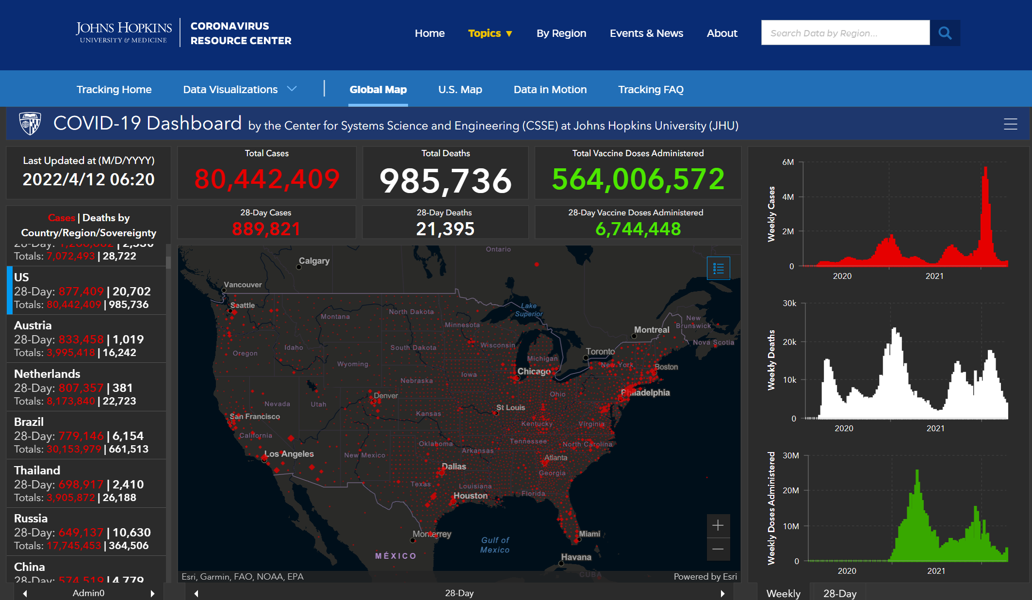 (觀察者網訊)根據美國約翰斯·霍普金斯大學統計數據,截至北京時間4月12日6時20分,美國新冠肺炎累計確診病例達到80442409例,累計死亡病例達到985736例。在過去約48小時裏,美國新增確診病例42935例,新增死亡病例254例。昨日(11日),該網站的數據未和往常一樣在同一時段進行更新。