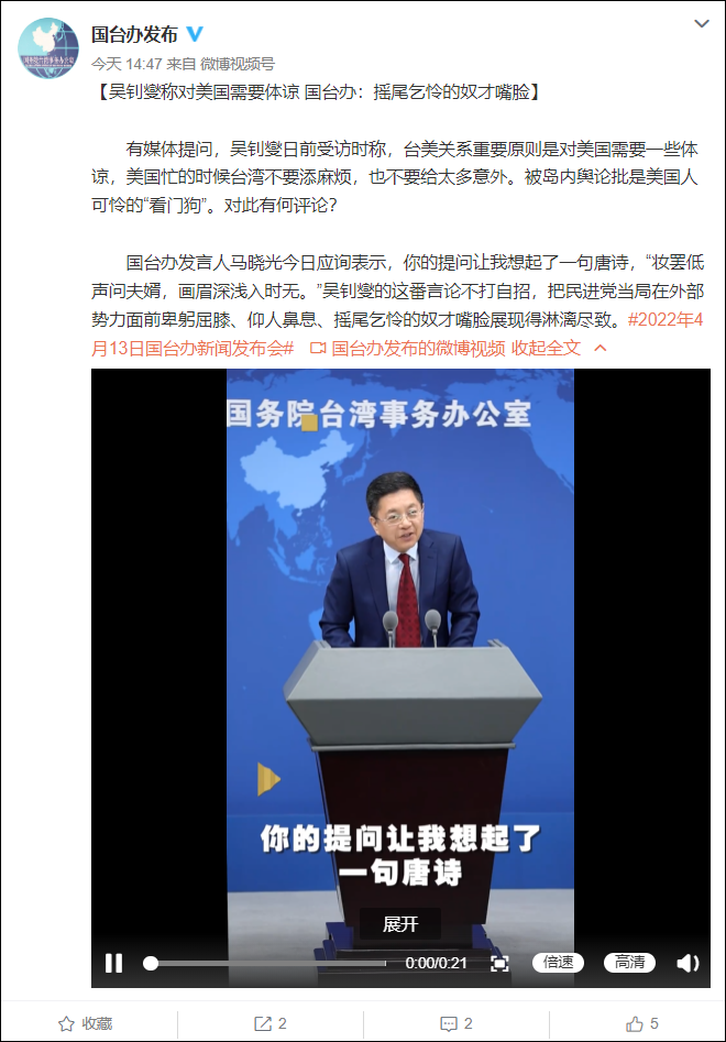 @國台辦發佈 4月13日消息,有媒體提問,吳釗燮日前受訪時稱,台美關係重要原則是對美國需要一些體諒,美國忙的時候台灣不要添麻煩,也不要給太多意外。被島內輿論批是美國人可憐的“看門狗”。對此有何評論?