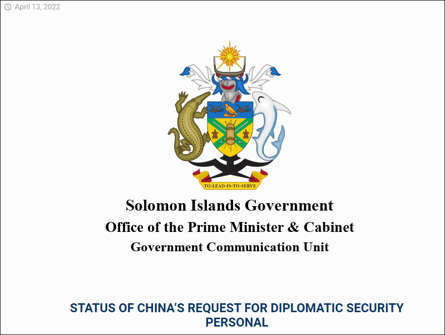 當地時間4月12日,ABC援引所謂“泄密文件”聲稱,去年年底所羅門羣島首都霍尼亞拉發生暴力騷亂後,中國駐所羅門大使館曾試圖進口一批槍支,並要求允許派一支10人的安保團隊進入霍尼亞拉,以保護當地中國外交官和大使館的安全。
