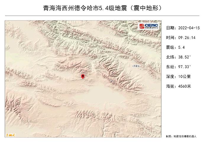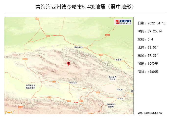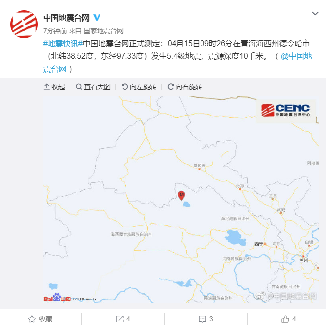 @中國地震台網 正式測定:04月15日09時26分在青海海西州德令哈市(北緯38.52度,東經97.33度)發生5.4級地震,震源深度10千米。