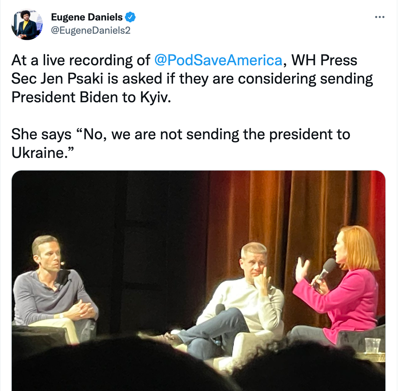當天的白宮簡報會上,有記者提問“總統是否要求去烏克蘭?”普薩基表示:“我們目前沒有讓美國總統去烏克蘭訪問的計劃。對烏克蘭領導人來説,最重要的是我們正加快提供武器,提供他們所需的援助和安全系統。”