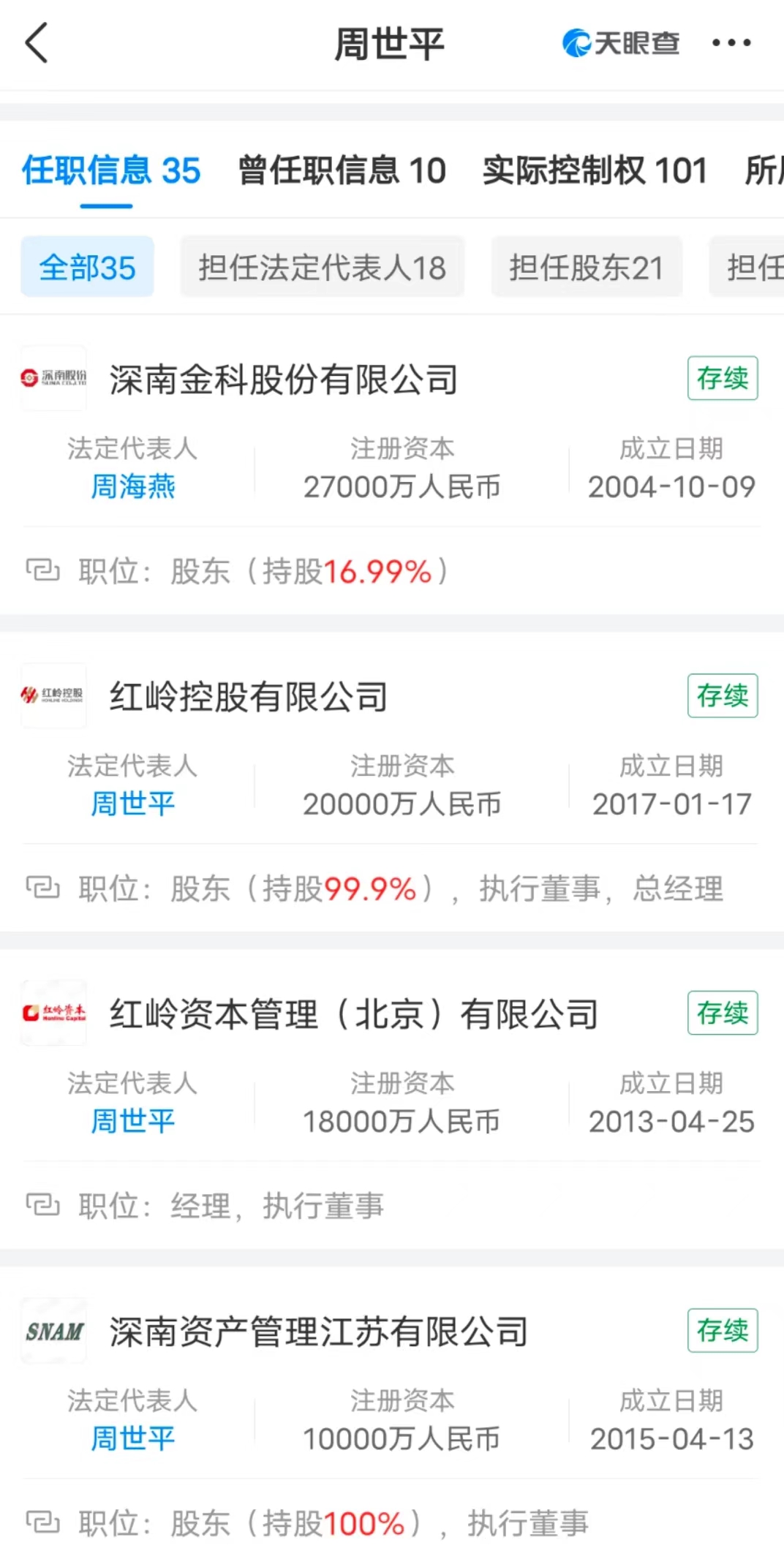 天眼查資料顯示,周世平自1993年開始長期專注於國內證券市場及上市公司的研究,有超過20年證券投資經驗,他實際控制的企業多達101家。