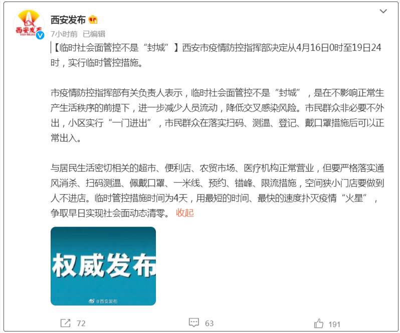 西安:臨時社會面管控不是“封城”。來源:@西安發佈