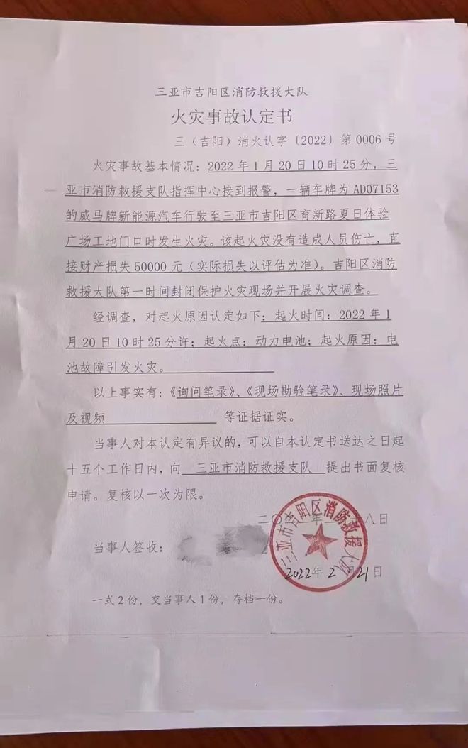根據三亞市消防部門出具的《火災事故認定書》顯示,起火原因“電池故障引發火災”。威馬方面堅稱車輛不存在問題,起火原因系碰撞導致。但該事故車起火前並未發生碰撞。