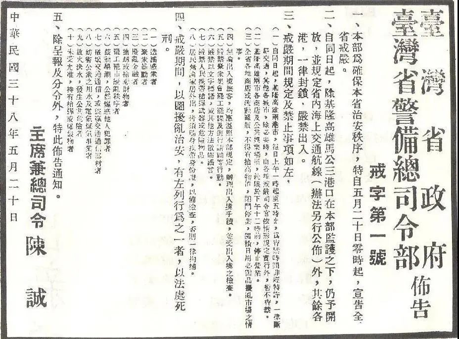 台灣當局戒嚴令,於1949年生效、1987年廢除