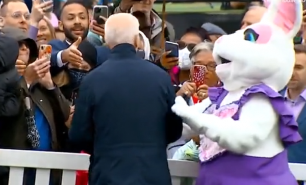 當時,拜登下台與孩子們合影,並與記者和客人們開始交談。當他開始談論巴基斯坦和阿富汗時,一個打扮成復活節兔子的人忽然跳了過來。