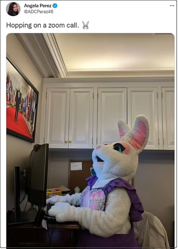目前還不知道這隻兔子的身份,但此前,白宮副新聞秘書安吉拉·佩雷斯(Angela Perez)曾發佈過一張工作照,是一隻穿着節日服裝的兔子坐在辦公桌旁。