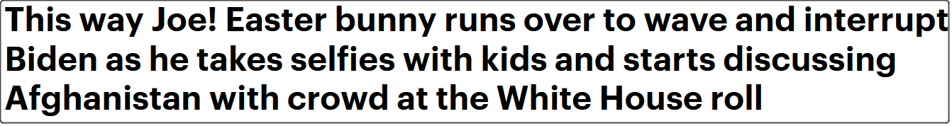 英國《每日郵報》同日透露,演講結束後,拜登下台與孩子們自拍,繼而和人羣開始談論巴基斯坦和阿富汗的問題。這時,一個打扮成復活節兔子的人偶跳了過來,帶走了拜登,打斷了談話。報道稱,拜登看起來很困惑。