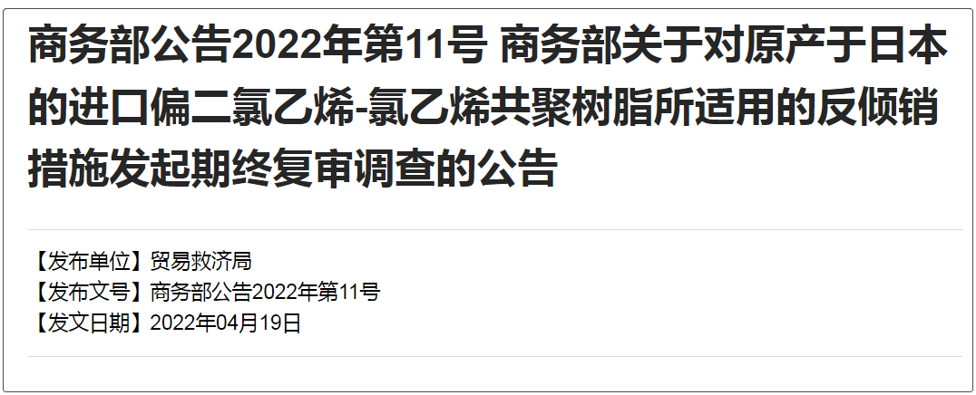 2022年1月10日,商務部收到浙江巨化股份有限公司代表中國偏二氯乙烯-氯乙烯共聚樹脂產業提交的反傾銷措施期終複審申請書。申請人主張,如果終止反傾銷措施,原產於日本的進口偏二氯乙烯-氯乙烯共聚樹脂對中國的傾銷可能再度發生,對中國產業造成的損害可能繼續或再度發生,請求商務部對原產於日本的進口偏二氯乙烯-氯乙烯共聚樹脂進行期終複審調查,並維持對原產於日本的進口偏二氯乙烯-氯乙烯共聚樹脂實施的反傾銷措施。