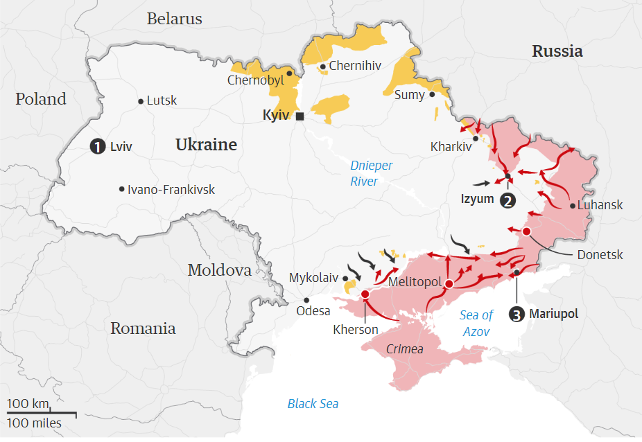 紅色為俄佔區,黑色及紅色箭頭分別為烏軍和俄軍進攻方向,圖自《衞報》