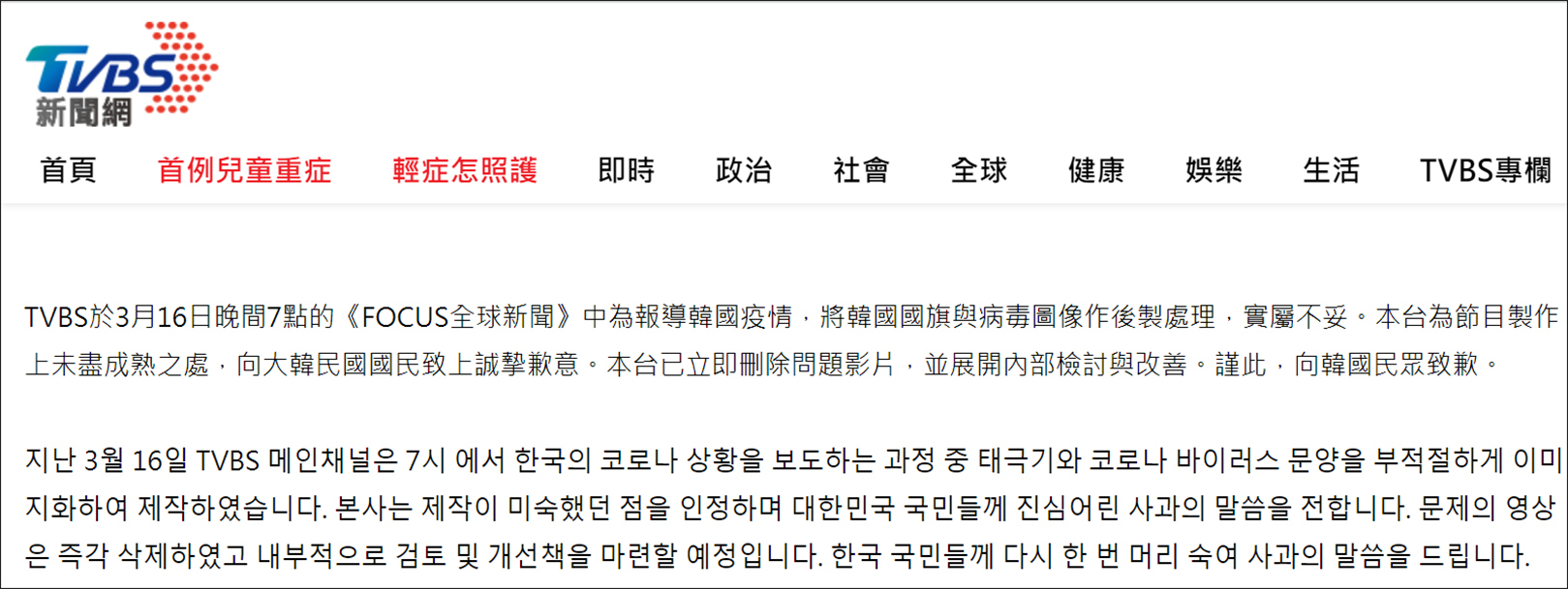 就此,TVBS電視台在19日發佈中文、韓文聲明向韓國民眾致歉,並表示已刪除問題視頻。