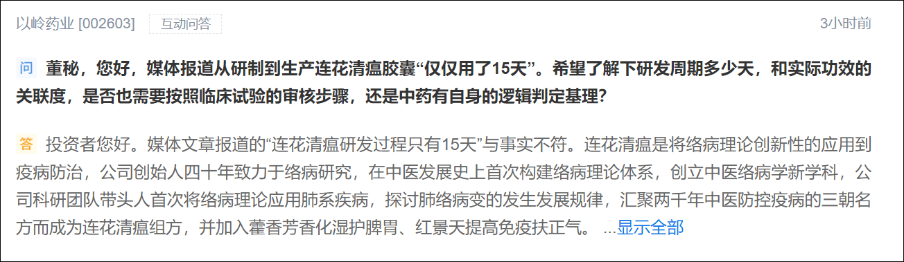 4月20日,以嶺藥業在深交所“互動易”平台對網傳“連花清瘟研發過程只有15天”、“連花清瘟未進行雙盲實驗”等問題進行了回應。
