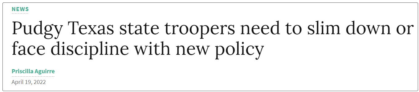 在新規文中,DPS 聲稱該政策旨在保持警察的健康和身體健康,還強調,超重的警員即使通過了所有的體能測試,仍然會因為超重而受到紀律處分。截至2022年4月,在得州的4000名警官中有213名未達到腰圍要求。