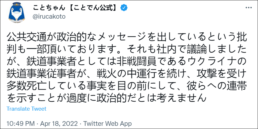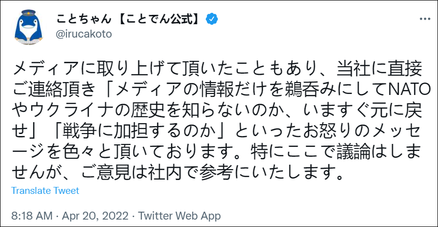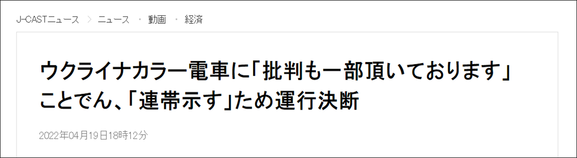 不過,琴電的這一做法在日本引發了爭議。據“J-CAST”新聞網站與《每日新聞》19日報道,雖然贊同、支持琴電的聲音有很多,但也有部分民眾持着批評態度。實際上,在琴電18日宣稱將列車塗色支持烏克蘭的短短數小時後,琴電就再次發推表示受到了批評。