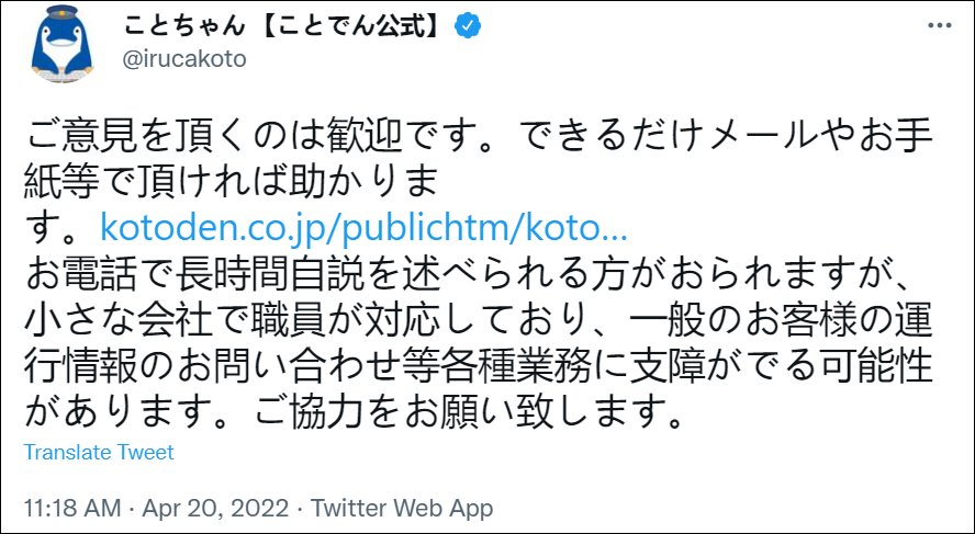 對於這些批評,琴電稱,公司將不在推特上做特別討論,公司內部會參考有關意見。在20日發佈的另一推文中,琴電還公佈了該公司的電子郵箱,稱希望人們儘量用郵件和寫信的方式提意見,因為有人會給該公司打電話打太長時間,容易影響到該公司回覆一般乘客的諮詢業務。