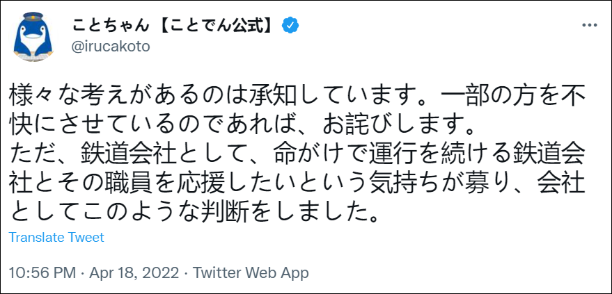 隨後,琴電又發了一條推文,為“此舉讓一部分人感到不快”而道歉,但也再次強調了該公司想支持烏克蘭鐵路工作人員的態度。