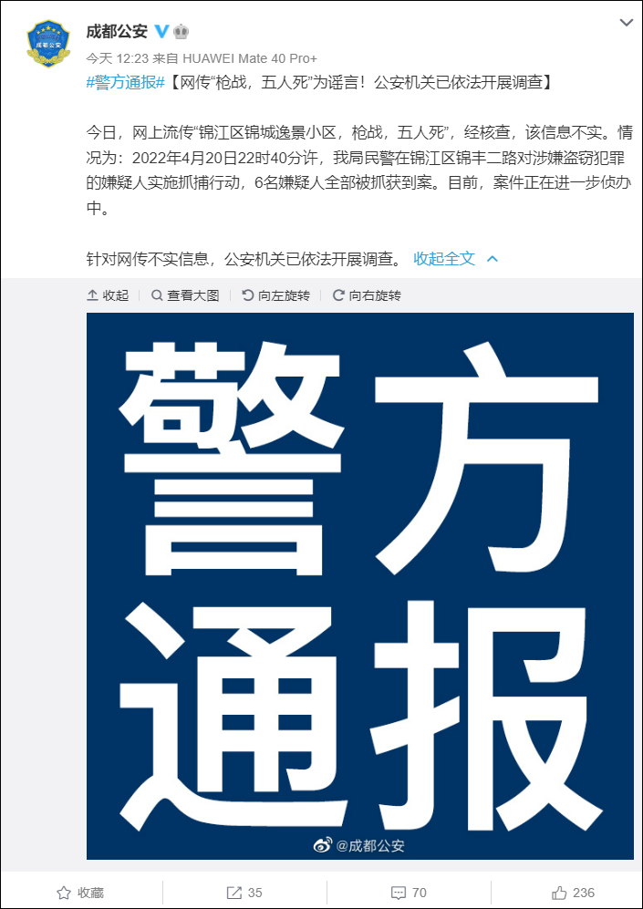 今日,網上流傳“錦江區錦城逸景小區,槍戰,五人死”,經核查,該信息不實。情況為:2022年4月20日22時40分許,我局民警在錦江區錦豐二路對涉嫌盜竊犯罪的嫌疑人實施抓捕行動,6名嫌疑人全部被抓獲到案。目前,案件正在進一步偵辦中。
