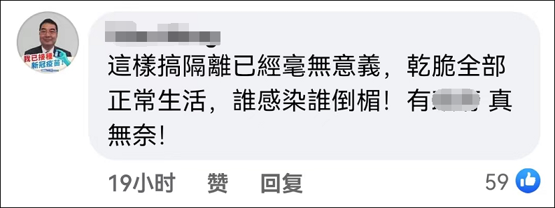 其中,有不少人認為隔離3天毫無意義,炮轟台當局在“擺爛”,推行這樣的方案就是讓“大家一起染疫”。有人還嘲諷道:“確診數越多放的越寬鬆,嫌台灣人確診太慢太少嗎?這不叫共存,叫同歸於盡吧。”