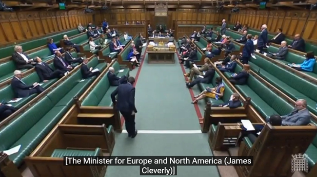 根據英國議會官網4月27日發佈的內容,前英國住房大臣羅伯特·詹裏克(Robert Jenrick)在當天的辯論中問克萊弗利,有沒有同烏克蘭和俄羅斯的外交官提起肖恩·平納(Sean Pinner)和艾登·阿斯林(Aiden Aslin) 的事情。詹裏克宣稱,兩人在俄羅斯正遭受酷刑和虐待,以滿足俄方的宣傳目的。他希望眾議院的所有人能一致譴責這種行為,並看到這兩人儘快獲釋。