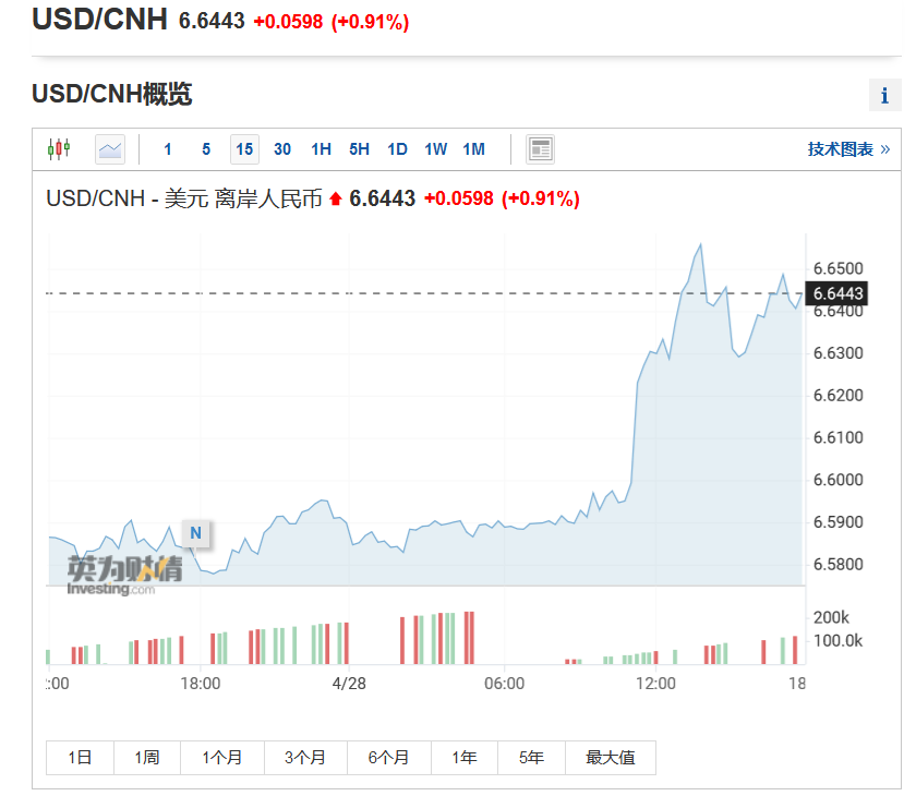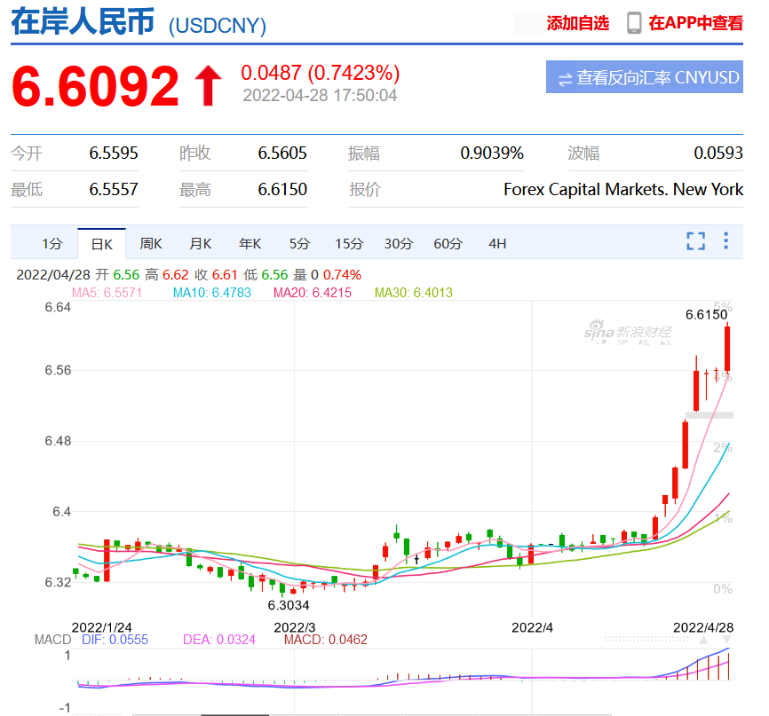 但是今日(28日)匯市再度出現震盪:據中國貨幣網數據,在岸人民幣兑美元今日下午跌破6.61關口,為2020年11月以來首次,日內跌逾400個基點。據交易行情報價,離岸人民幣兑美元一度跌破6.65關口,跌逾600點。