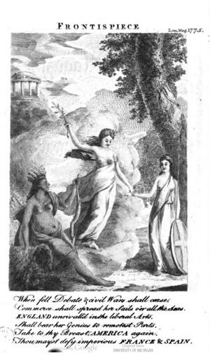 美國獨立戰爭前夕,英美關係惡化,戰爭一觸即發,萊剋星頓槍聲迫在眉睫。1775 年1月,《倫敦雜誌》的扉頁刊登了一幅象徵和平的版畫,和平女神從聖殿的雲中降下,為美國和不列顛帶來了橄欖枝,同年7月,美國也通過了“橄欖枝請願書”,希望避免與英國發生全面戰爭,雖然對和平的呼籲並不是此次生效,但是橄欖枝作為和平的標誌似乎是當時西方世界的共識。