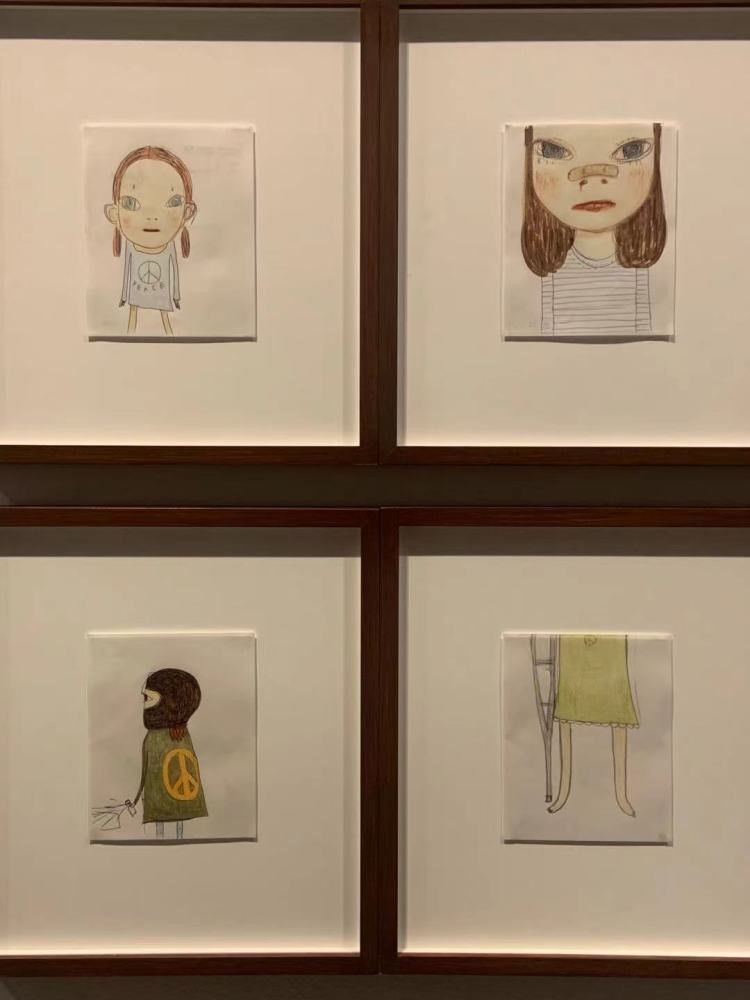 值得注意的是,此次上海展出的奈良美智畫作手稿中經常出現一個由一豎、反轉V字和圓形組成的標誌,即大家所熟知的“反戰標誌”。