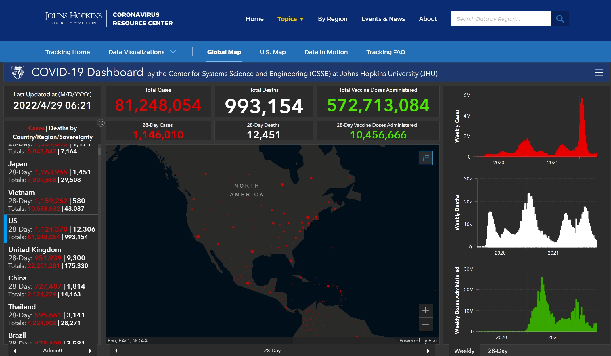 (觀察者網訊)根據美國約翰斯·霍普金斯大學統計數據,截至北京時間4月29日6時21分,美國新冠肺炎累計感染病例達到81248054例,累計死亡病例達到993154例。在過去約24小時裏,美國新增感染病例86361例,新增死亡病例686例。