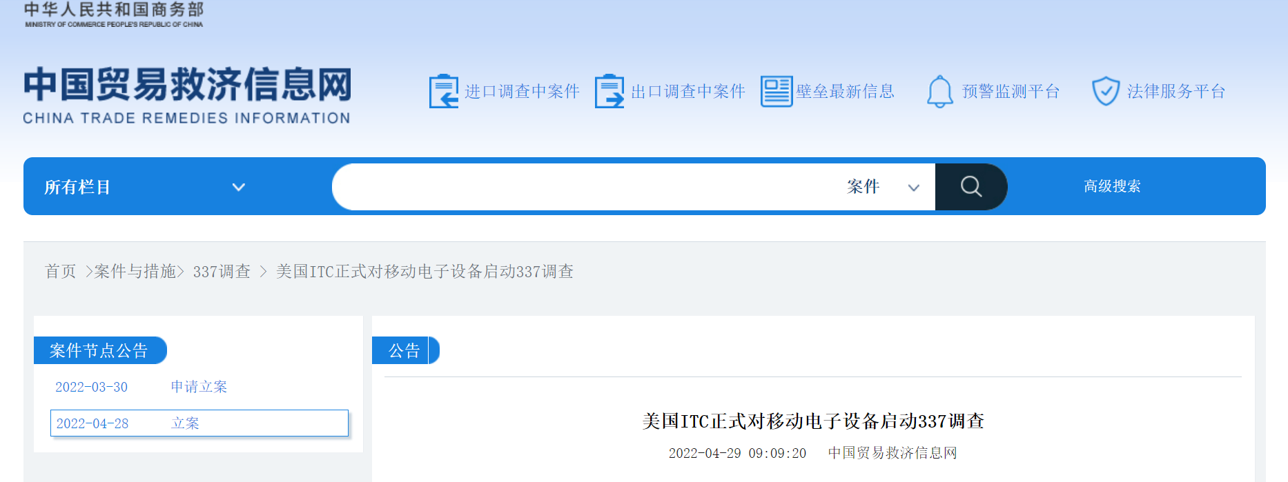 中國貿易救濟信息網消息,2022年4月28日,美國國際貿易委員會(ITC)投票決定對特定移動電子設備(Certain Mobile Electronic Devices)啓動337調查(調查編碼:337-TA-1312)。