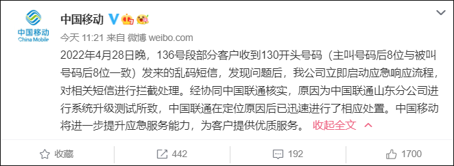@中國移動 4月29日消息,2022年4月28日晚,136號段部分客户收到130開頭號碼(主叫號碼後8位與被叫號碼後8位一致)發來的亂碼短信,發現問題後,我公司立即啓動應急響應流程,對相關短信進行攔截處理。經協同中國聯通核實,原因為中國聯通山東分公司進行系統升級測試所致,中國聯通在定位原因後已迅速進行了相應處置。中國移動將進一步提升應急服務能力,為客户提供優質服務。