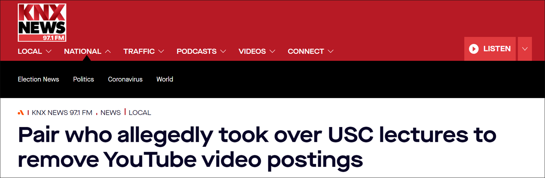 據據加州洛杉磯廣播電台KNX29日報道,被起訴的兩名YouTube主播分別是歐內斯特·卡內夫斯基(Ernest Kanevsky)和白宇國(音譯,Yuguo Bai)。早在4月8日,洛杉磯高等法院法官詹姆斯·C·查爾凡特(James C. Chalfant)就對兩人下達了臨時限制令,禁止他們進入南加大校園。