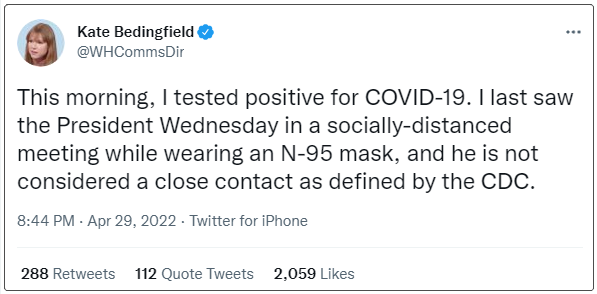 貝丁菲爾德在推特上表示:“今天早上,我被確診為陽性。我最後一次見到拜登總統是在週三(4月27日)的會議上,當時我戴着N-95口罩,他(拜登)並未被CDC認定為密接者。”