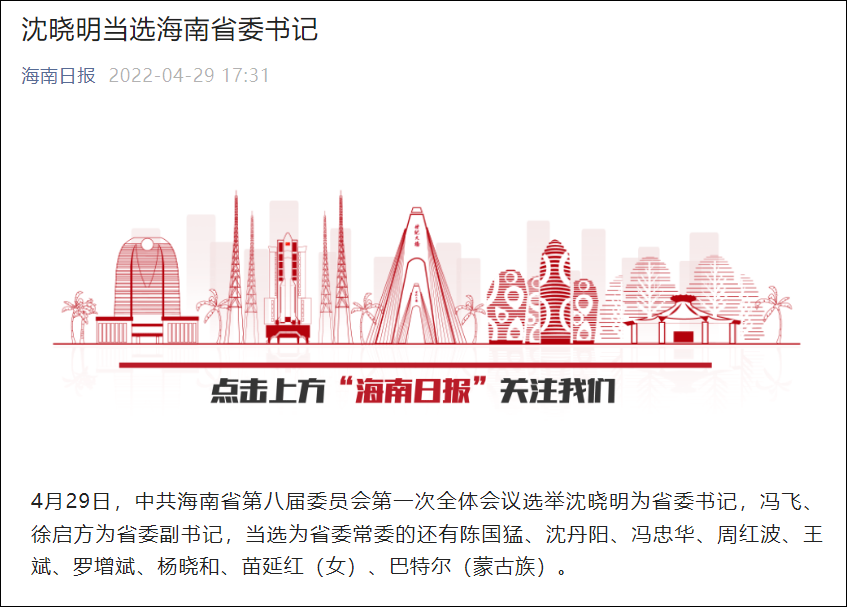 4月29日,中共海南省第八屆委員會第一次全體會議選舉沈曉明為省委書記,馮飛、徐啓方為省委副書記,當選為省委常委的還有陳國猛、沈丹陽、馮忠華、周紅波、王斌、羅增斌、楊曉和、苗延紅(女)、巴特爾(蒙古族)。