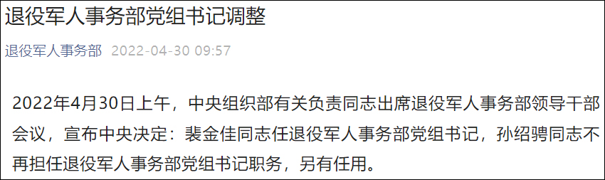 據“退役軍人事務部”微信公眾號發佈,2022年4月30日上午,中央組織部有關負責同志出席退役軍人事務部領導幹部會議,宣佈中央決定:裴金佳同志任退役軍人事務部黨組書記,孫紹騁同志不再擔任退役軍人事務部黨組書記職務,另有任用。