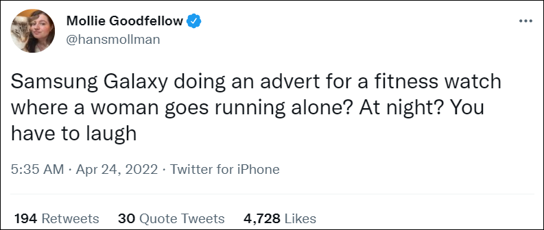 作家莫莉·古德費羅(Mollie Goodfellow)也批評道:“三星做了一個健身手錶的廣告,裏面有一個女人獨自跑步?還在晚上?”