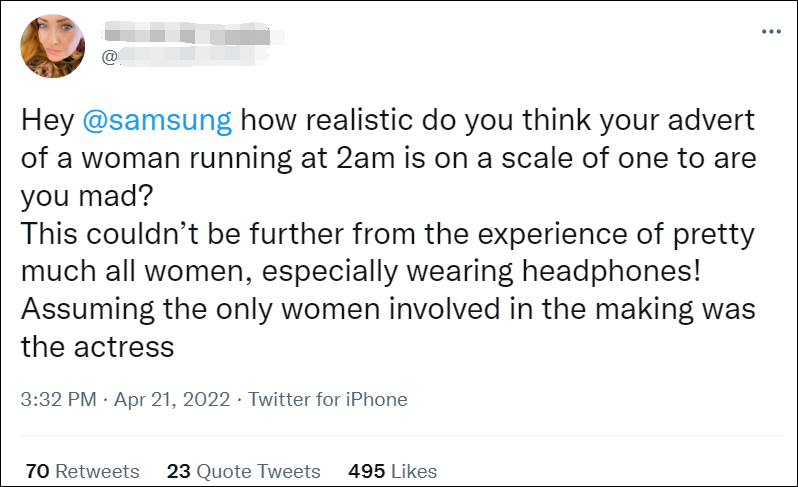 一名推特用户評論道:“嘿,三星,你覺得你的廣告中一個女人凌晨2點跑步有多現實,你瘋了嗎?這與幾乎所有女性的經歷相去甚遠,尤其是戴着耳機這一點!我只能假設參與制作的唯一女性就是廣告片中的女演員。”