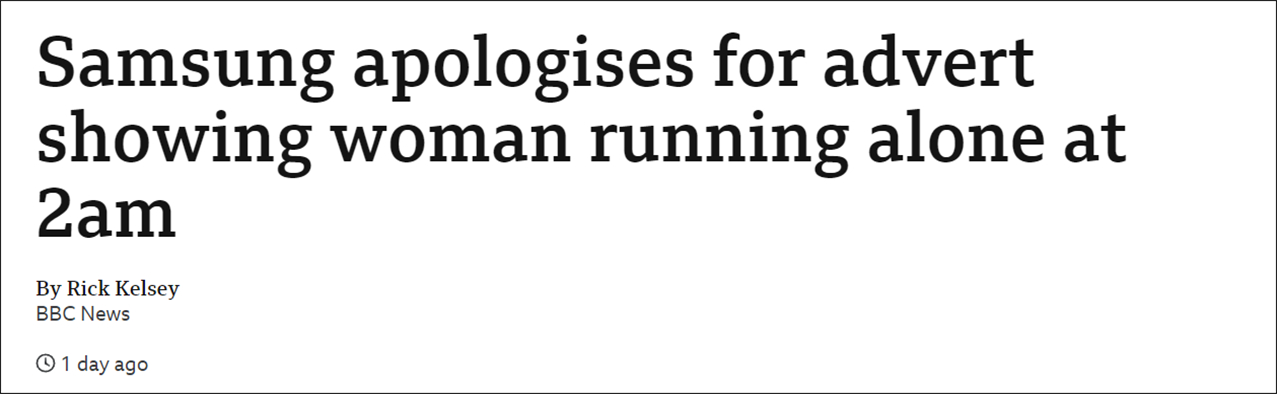 (觀察者網訊)據英國廣播公司(BBC)29日報道,近日,三星的一則廣告引發爭議,在該廣告中,一名女子凌晨2點起牀,獨自一人在城市的街道上跑步。