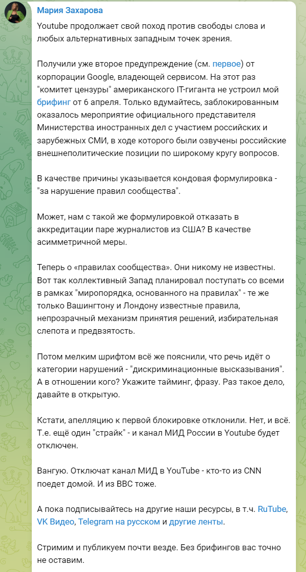 扎哈羅娃透露,俄方已經第二次收到了Youtube所屬谷歌公司的“警告”。扎哈羅娃表示,這次,美國IT巨頭的“審查委員會”對其在4月6日舉行的新聞吹風會上的發言表達了不滿。