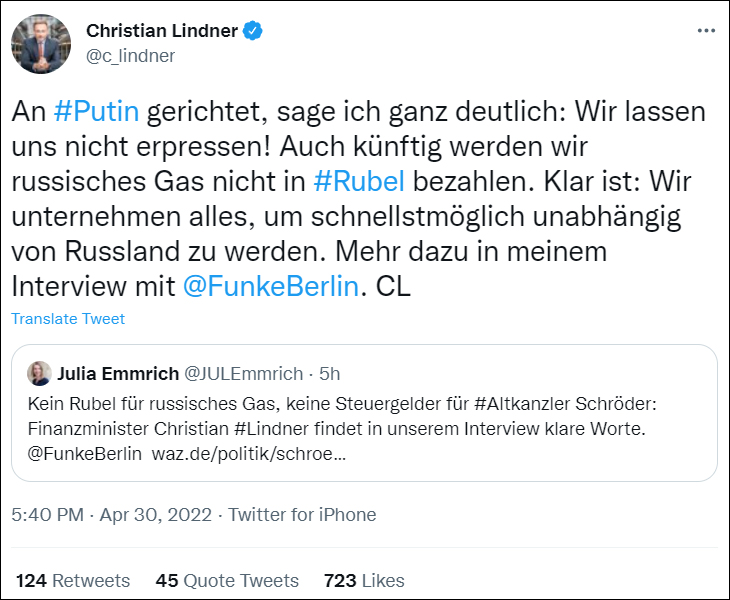 (觀察者網訊)4月30日,剛從新冠中恢復的德國財政部長克里斯蒂安·林德納發推稱,無論是現在還是將來,德國都拒絕使用盧布支付俄羅斯天然氣。