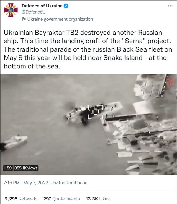 (觀察者網訊)烏克蘭國防部推特賬號7日表示,烏克蘭TB-2無人機在蛇島碼頭摧毀了俄軍一艘“巖羚羊”級(Serna)登陸艇。