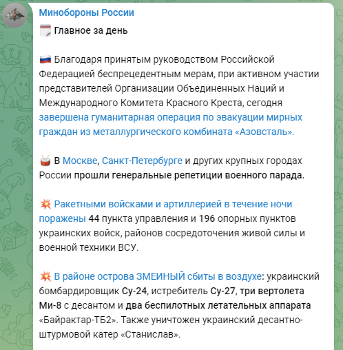 俄羅斯國防部Telegram賬號8日發佈通報稱,俄軍在蛇島地區擊落一架烏克蘭Su-24戰鬥轟炸機、一架Su-27戰鬥機、三架Mi-8直升機和兩架TB-2無人機。俄方還稱,烏克蘭裝甲突擊艇“斯坦尼斯拉夫”號(Станислав)也被摧毀。