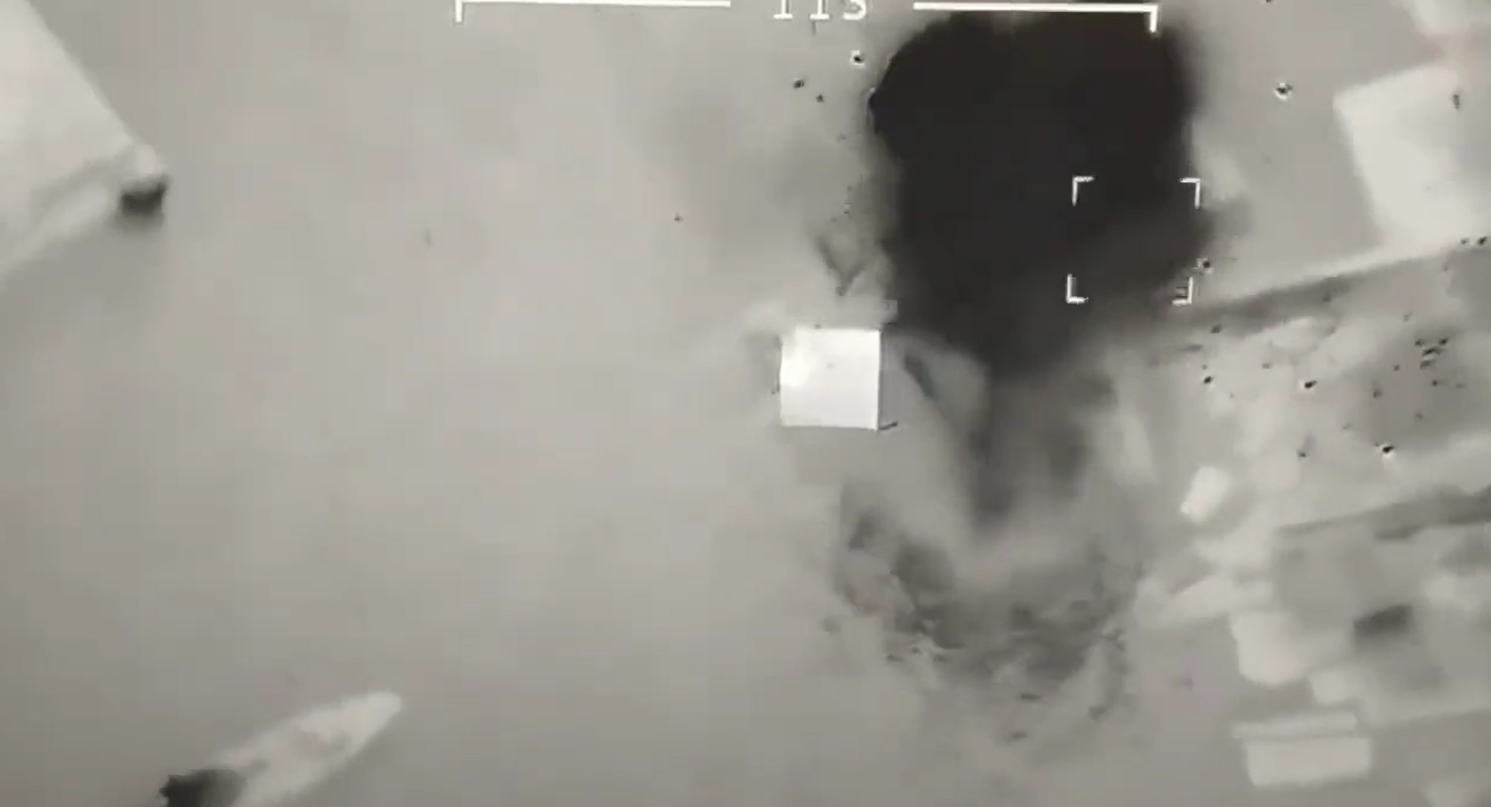 烏方公佈的一段航拍視頻顯示,一艘輕型艦艇發生爆炸,並有殘骸向四周散出。