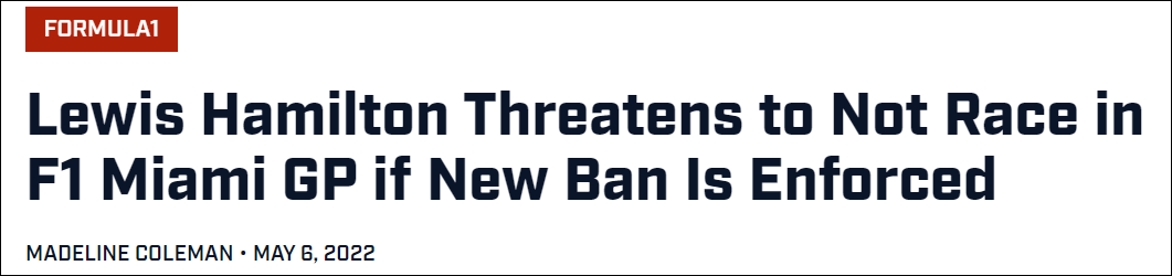 8日,漢密爾頓出現在2022年F1邁阿密大獎賽排位賽賽場上,並獲得第6名。據《衞報》8日報道,賽後漢密爾頓再次被問及珠寶禁令一事,而他明確表示將會繼續反對這一禁令。