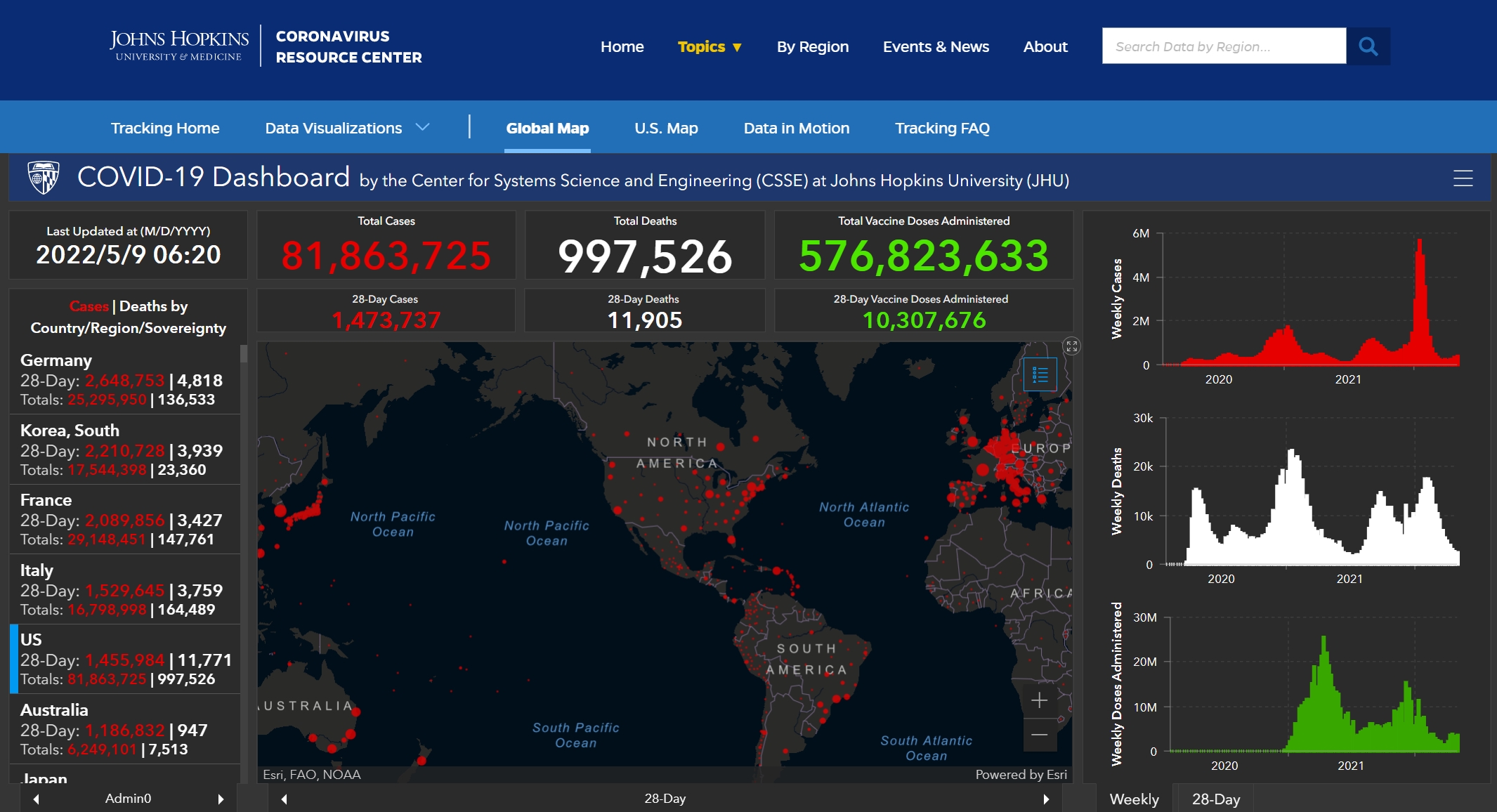 (觀察者網訊)根據美國約翰斯·霍普金斯大學統計數據,截至北京時間5月9日6時20分,美國新冠肺炎累計感染病例達到81863725例,累計死亡病例達到997526例。在過去約24小時裏,美國新增感染病例13089例,新增死亡病例23例。