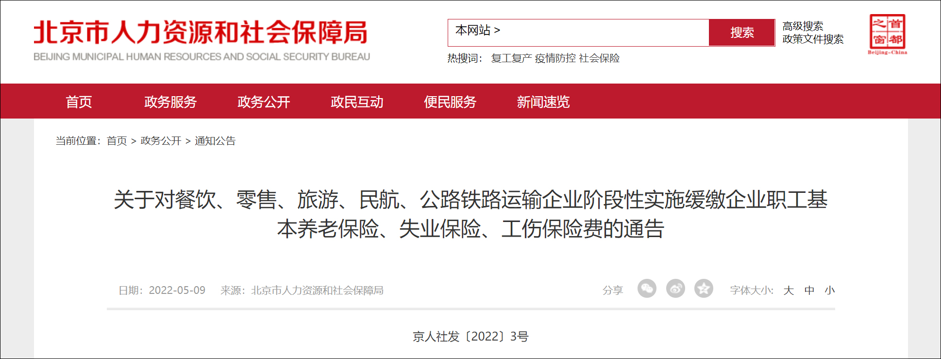 北京市人力資源和社會保障局網站5月9日消息,北京市人力資源和社會保障局、國家税務總局北京市税務局、北京市財政局、北京市商務局、北京市文化和旅遊局、北京市發展和改革委員會、北京市交通委員會、北京市市場監督管理局、北京市醫療保障局發佈《關於對餐飲、零售、旅遊、民航、公路鐵路運輸企業階段性實施緩繳企業職工基本養老保險、失業保險、工傷保險費的通告》。