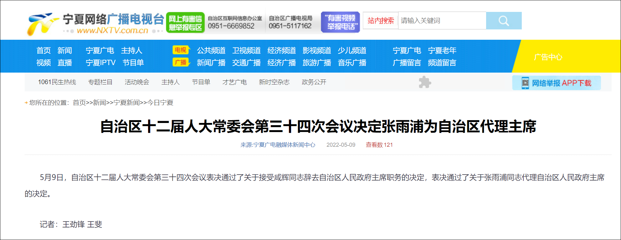5月9日,自治區十二屆人大常委會第三十四次會議表決通過了關於接受鹹輝同志辭去自治區人民政府主席職務的決定,表決通過了關於張雨浦同志代理自治區人民政府主席的決定。