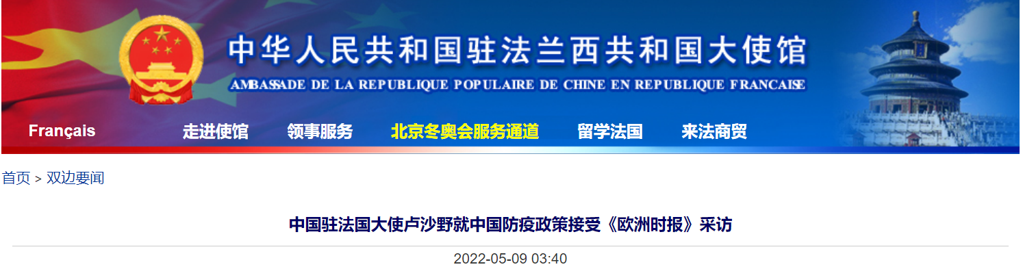**盧大使:**事實和數據表明,堅持“動態清零”是符合中國國情的科學選擇。我們注意到,一些法國專業人士對此表示理解。巴斯德研究所流行病學專家阿爾諾·豐塔內(Arnaud Fontanet)接受法媒採訪時表示:“中國人均重症病牀數量比法國少2倍……如果病毒蔓延,醫療系統可能很快面臨飽和。必須最大限度降低人員流動,限制病毒傳播風險。”