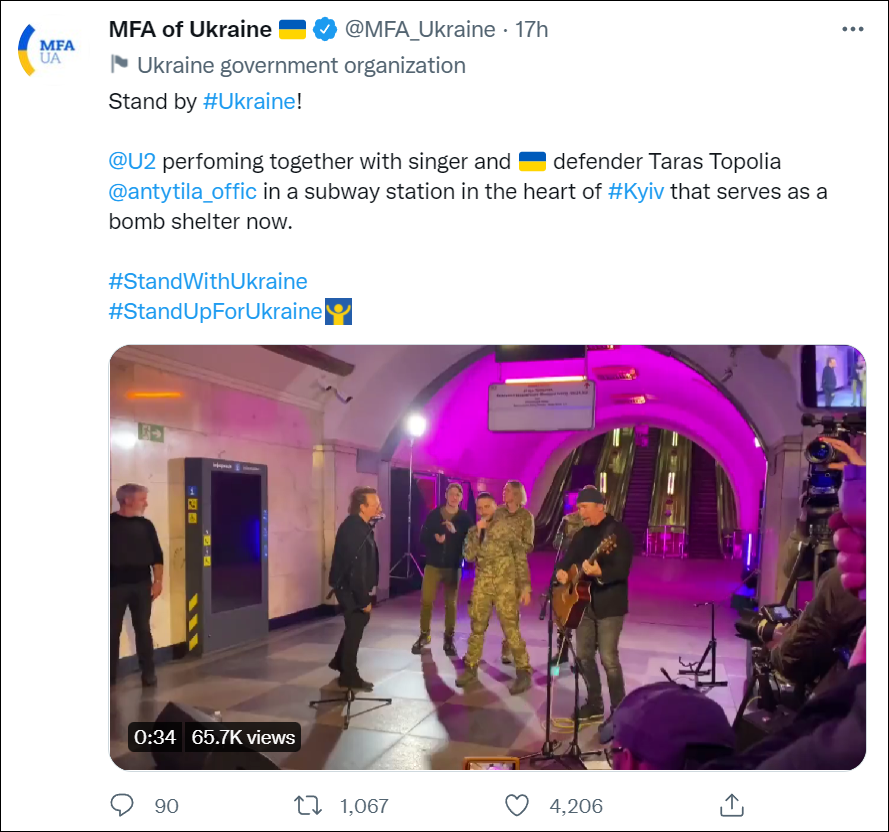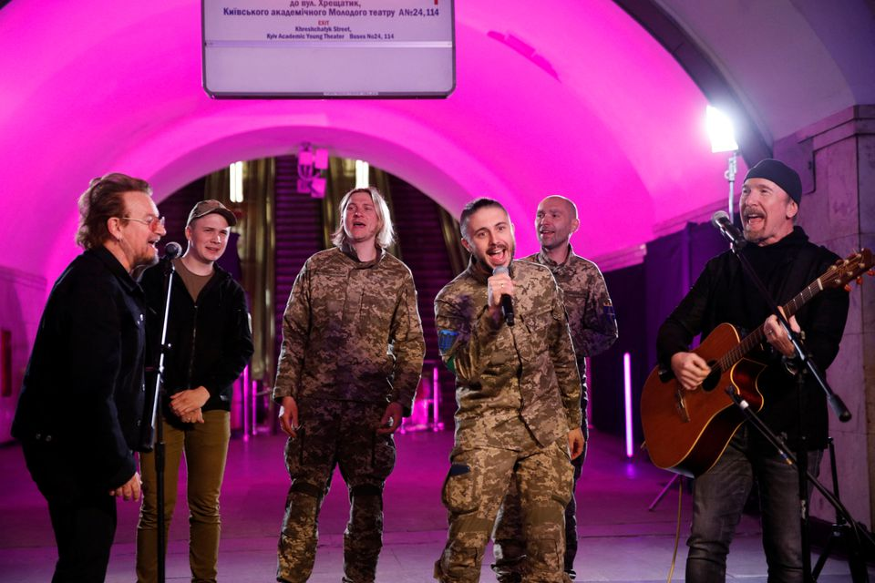 澤連斯基邀請愛爾蘭搖滾樂隊U2成員在基輔地鐵站表演助陣,還有烏士兵共同開唱
