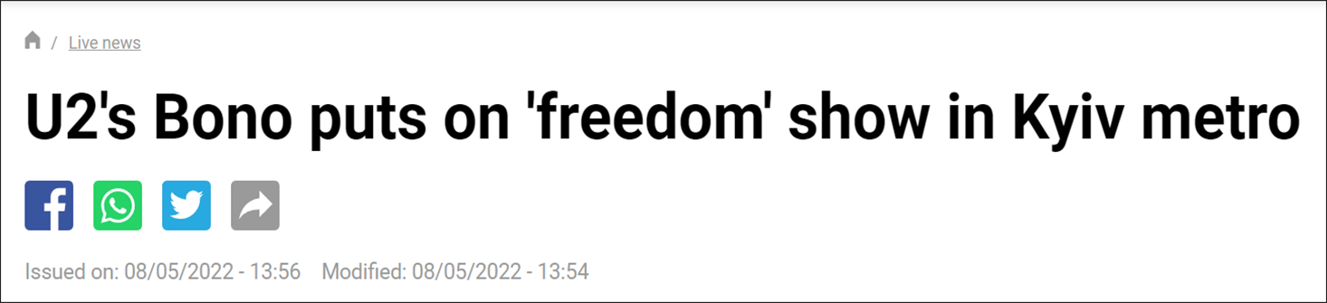 “你們的總統(澤連斯基)現在正領導着全世界的自由事業……烏克蘭人民不僅是在為自己的自由而戰,也是在為我們所有熱愛自由的人而戰,”Bono對聚集在赫雷夏蒂克(Khreschatyk)地鐵站內的100多名觀眾説道。