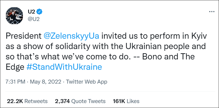 Bono和The Edge是應邀前往基輔的。U2樂隊推特賬號8日發佈的一條推文解釋道:“澤連斯基總統邀請我們在基輔演出,以顯示與烏克蘭人民的團結,這就是我們來這裏的目的——Bono和The Edge。”