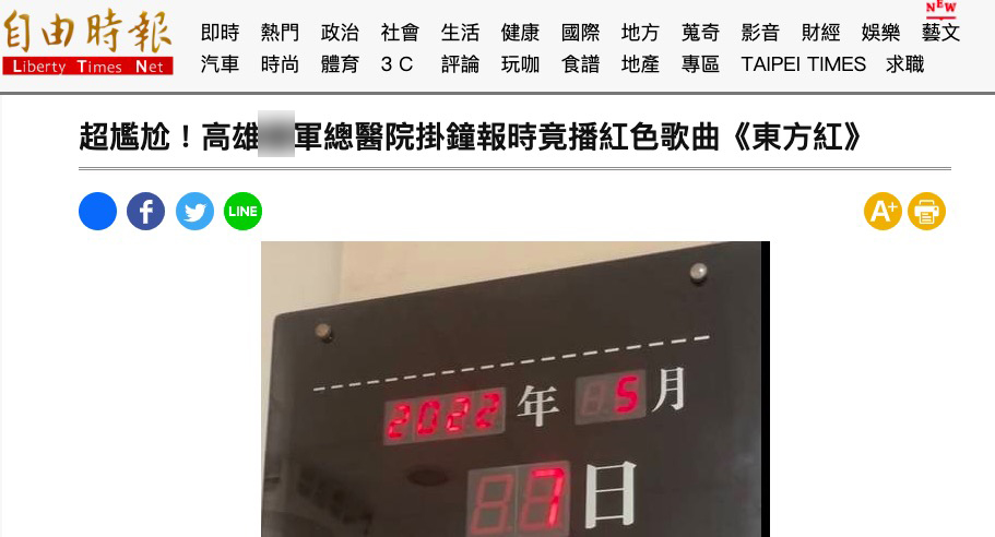 5月8日中午,島內媒體人董泓志在臉書發佈一段攝自台軍高雄總醫院的30秒視頻。只見醫院一樓大廳的電子時鐘顯示時間為5月7日中午12時左右,報時音樂聽起來是《東方紅》的旋律。